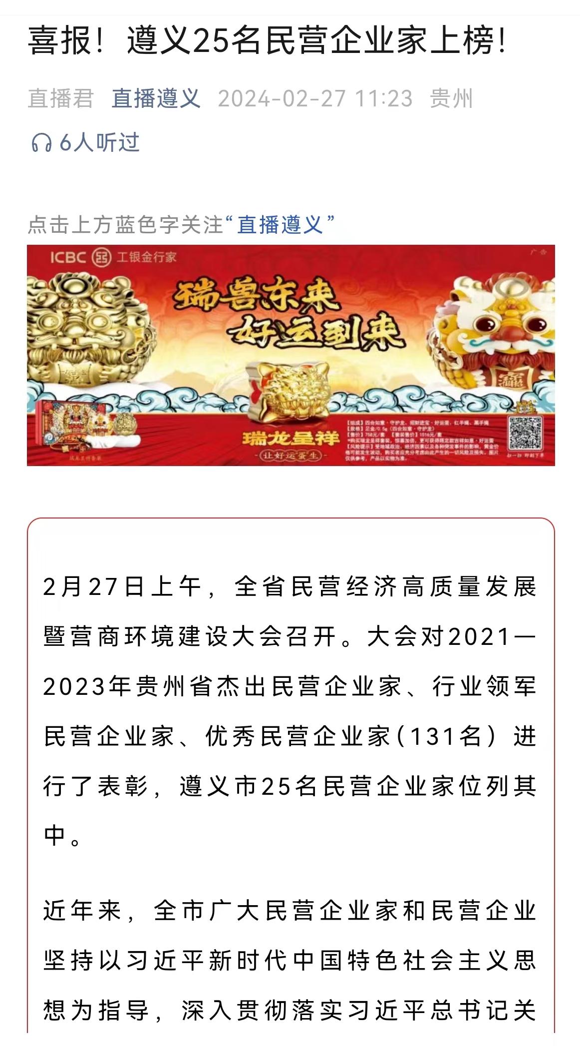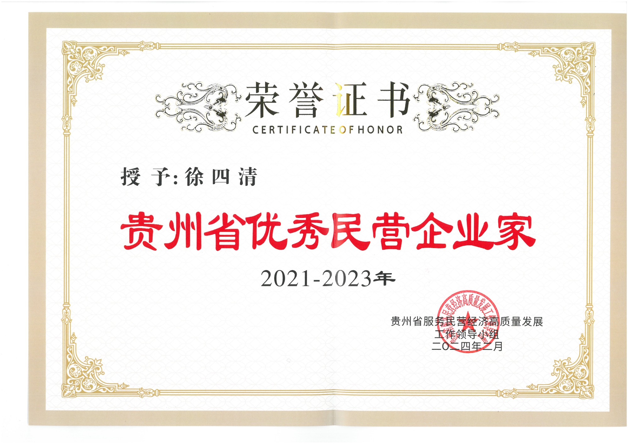 2月27日上午,全省民營經(jīng)濟(jì)高質(zhì)量發(fā)展暨營商環(huán)境建設(shè)大會(huì)召開。大會(huì)對(duì)2021—2023年貴州省杰出民營企業(yè)家、行業(yè)領(lǐng)軍民營企業(yè)家、優(yōu)秀民營企業(yè)家(131名)進(jìn)行了表彰。遵義建工(集團(tuán))有限公司董事長徐四清榮獲“貴州省優(yōu)秀民營企業(yè)家”稱號(hào)。