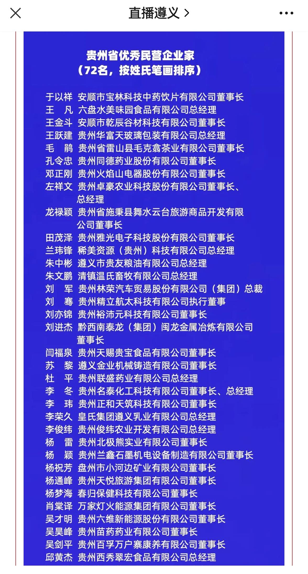 大會(huì)為表彰先進(jìn),激勵(lì)更多企業(yè)做強(qiáng)做優(yōu)做大、積極投身貴州現(xiàn)代化建設(shè)新征程,貴州省服務(wù)民營經(jīng)濟(jì)高質(zhì)量發(fā)展工作領(lǐng)導(dǎo)小組決定,授予陶華碧等10名同志2021—2023年“貴州省杰出民營企業(yè)家”稱號(hào);授予丁遠(yuǎn)懷等49名同志2021—2023年“貴州省行業(yè)領(lǐng)軍民營企業(yè)家”稱號(hào);授予徐四清等72名同志2021—2023年“貴州省優(yōu)秀民營企業(yè)家”稱號(hào)。